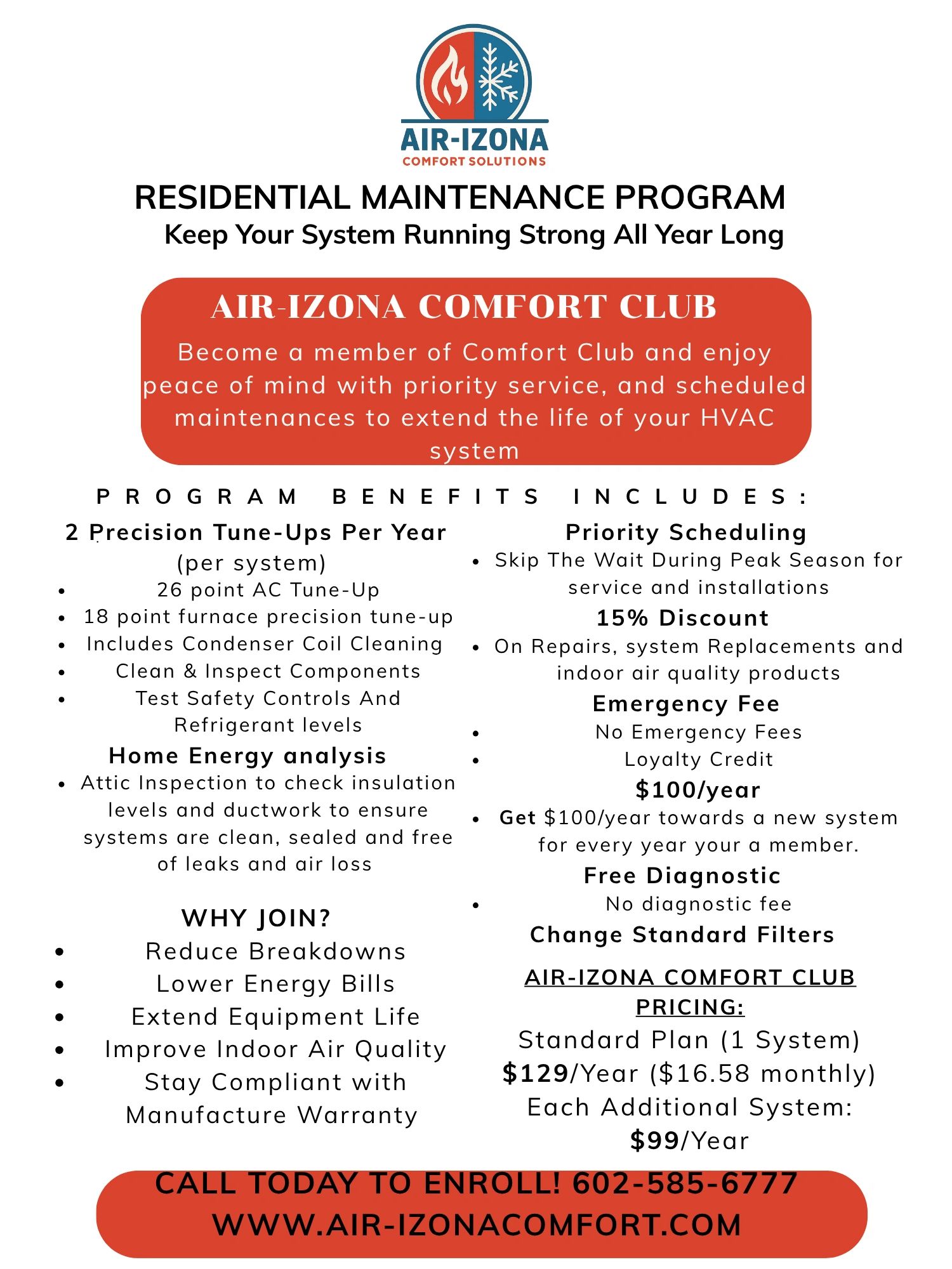 Join the Air-izona Comfort Club and keep your home running at peak performance year-round! Our members enjoy exclusive perks like priority scheduling, discounted repairs, and seasonal maintenance to prevent costly breakdowns before they happen. Designed for Arizona homeowners who value reliability and peace of mind.