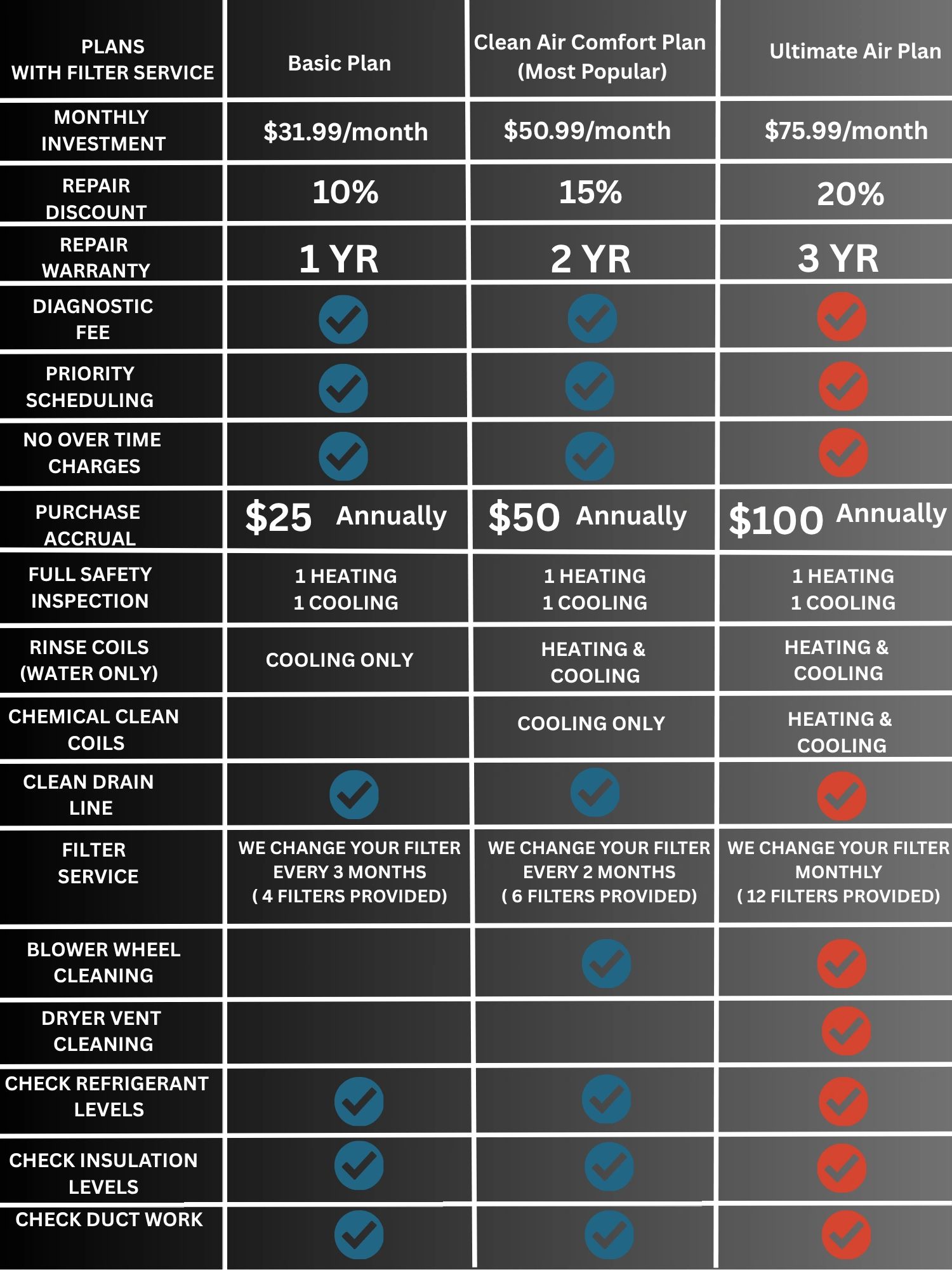 The ultimate peace-of-mind plan — monthly filter changes, full coil and vent cleaning, priority service, and zero overtime fees. Enjoy maximum system performance, 20% repair savings, and our longest 3-year warranty protection. available. With monthly filter changes, comprehensive coil and dryer vent cleaning, and priority service with no overtime fees, your system stays in elite condition. Enjoy a 20% repair discount, a 3-year repair warranty, and every maintenance service we offer all designed to maximize efficiency, extend equipment life, and deliver the purest, most consistent air possible.